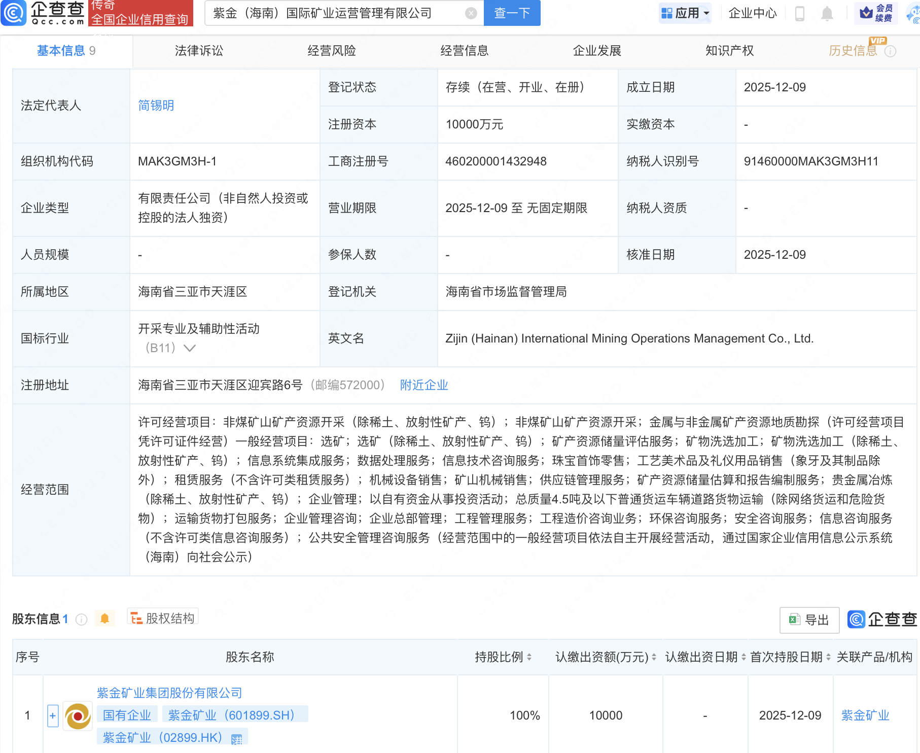 近日,紫金(海南)国际矿业运营管理有限公司成立,注册资本1亿元,经营范围包含:非煤矿山矿产资源开采;金属与非金属矿产资源地质勘探;供应链管理服务;矿产资源储量估算和报告编制服务等。企查查股权穿透显示,该公司由紫金矿业(601899)全资持股。